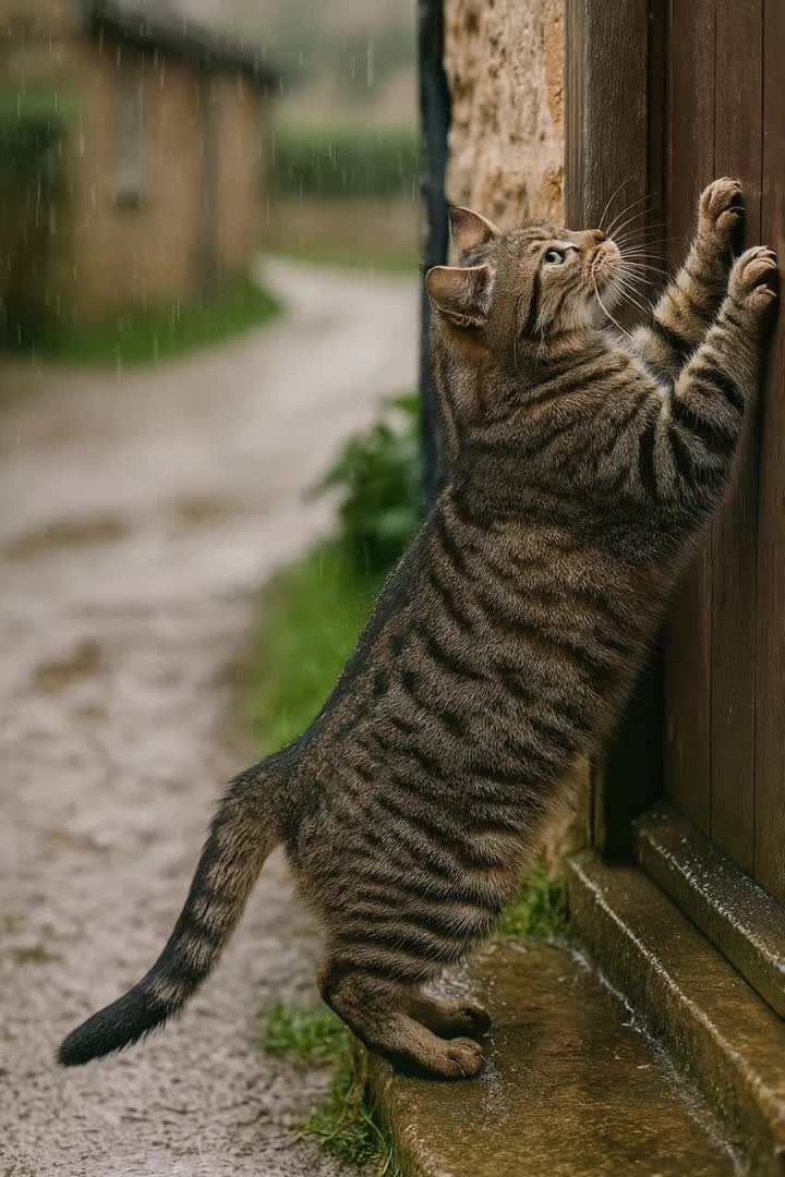 Outside, rain poured steadily, turning the streets quiet and still. Most had taken shelter indoors, but amid the storm, a small cat appeared, soaked and trembling. She scratched softly at a nearby door, her faint cries almost lost in the sound of thunder. Inside, an elderly man sat beside the fire, listening to the rhythm of the rain — until he heard that delicate sound and rose to investigate.