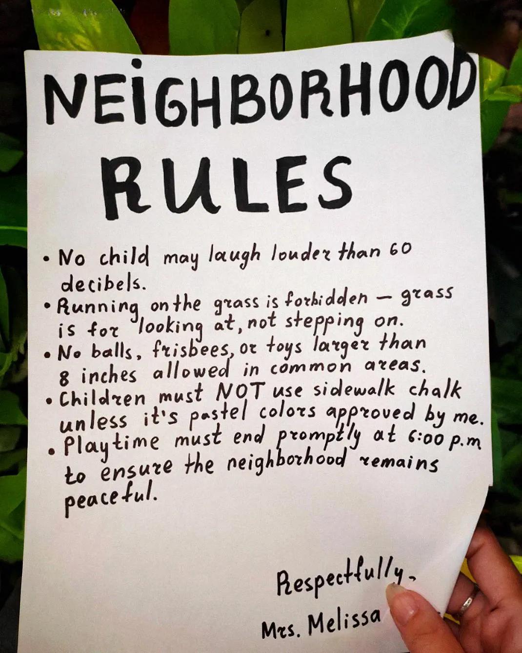 When my family moved to Silver Springs, it felt like a dream come true. Our new home had a big backyard, quiet streets, and plenty of space for our kids, Simon and Abby, to run and play.At first, everything was perfect. That is, until we found a typed letter taped to our door titled “Neighborhood Rules.” The list was bizarre: no laughter above 60 decibels, no running on the grass, no toys over 8 inches in public spaces, and playtime ending strictly at 6 p.m. It was signed by our next-door neighbor, Melissa.