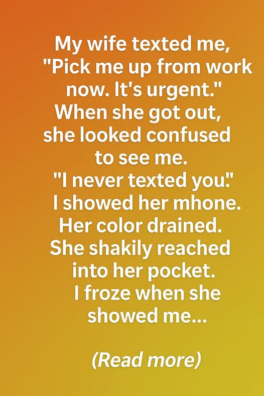 My wife texted me, “Pick me up from work now. It’s urgent.”I rushed over without hesitation. When she got into the car, she looked completely confused to see me.“I never texted you,” she said, her voice trembling.