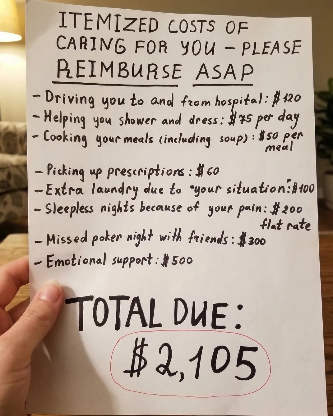 Three days after returning home from major surgery, I noticed a piece of paper taped to our refrigerator that stopped me cold. It wasn’t a reminder or a to-do list—it was a breakdown of the “costs” my husband believed he had accumulated while helping me recover. Until that moment, I thought our seven-year marriage rested on mutual care and unspoken understanding. Support, I believed, was something we gave freely. That note revealed a painful truth: we were operating under very different definitions of partnership.